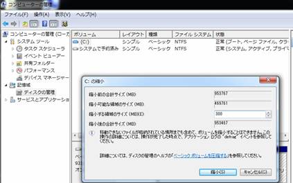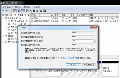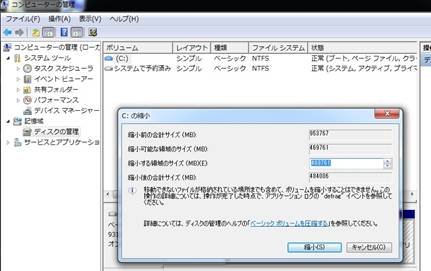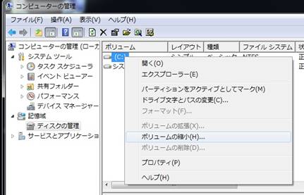 Cドライブを右クリックして、「ボリュームの縮小」 |